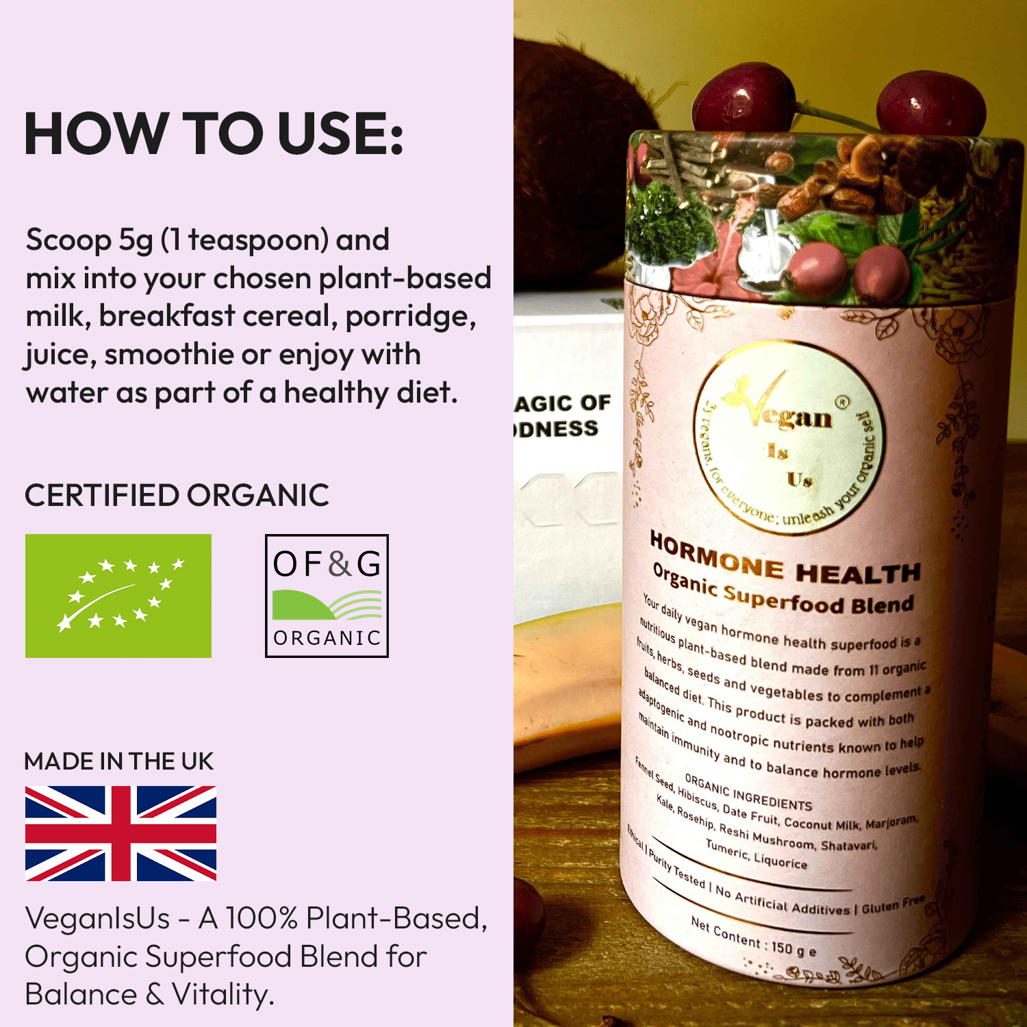 Mix 5g (approx. 1 tsp) daily into a smoothie, herbal tea, or plant-based drink as part of your hormone-support routine.